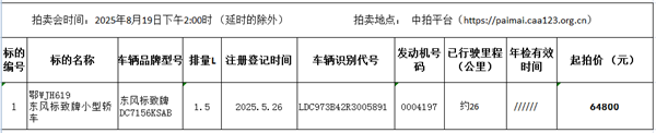 以上車輛自發(fā)布公告之日起在標的所在地公開展示。競買人現(xiàn)場查驗車輛需提前電話聯(lián)系,看樣時間公告之日起至2025年8月18日17:00止(工作時間),聯(lián)系人:高經(jīng)理 18071110981。